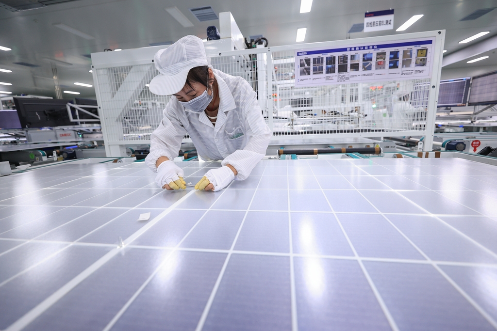 配文:10月15日,江苏省连云港市赣榆经济开发区一家新能源企业,工人正在加紧生产一批出口外洋的太阳能光伏电池组件。