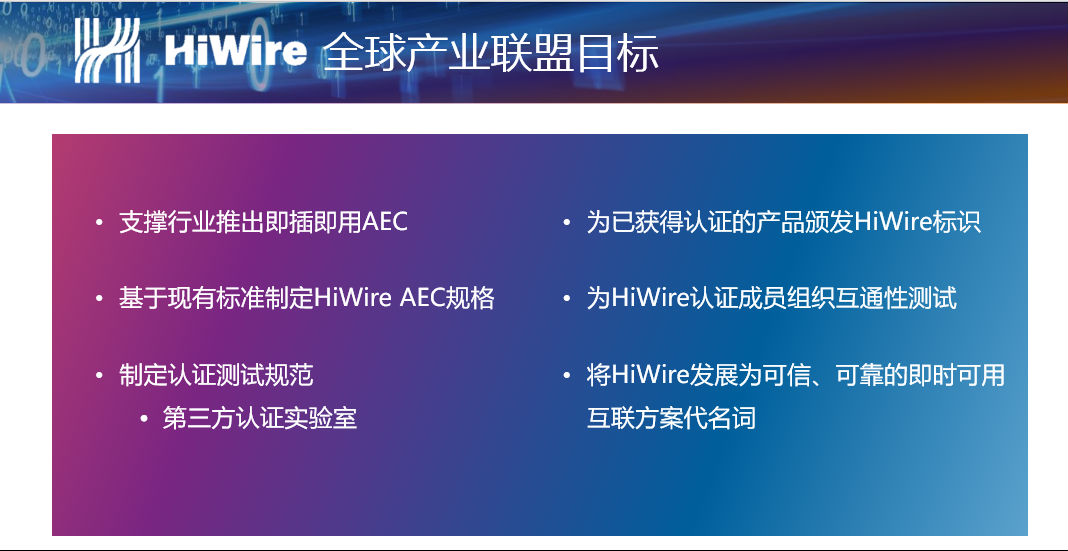HiWireÖÂÁ¦ÓÚ½¨ÉèºÍÒ»Á¬¿ª·¢AEC±ê×¼£¬¸Ã±ê×¼½ç˵ÁËÖÚ¶àÒµ½ç¶àÔ´ÐÒé(multi-source agreements£¬MSAs)µÄÏêϸʵÑéÒªÁìºÍÕýʽµÄÈÏÖ¤Àú³Ì¡£2019Äê9ÔÂÓÉCredo¡¢Keysight¡¢DellEMCµÈ28¼ÒÀ´×ÔÔÆ·þÎñÌṩÉÌ¡¢·þÎñÆ÷ÌṩÉÌ¡¢¸ßËÙ½»Á÷»úоƬ¡¢´«ÊäоƬ¡¢¹âÄ£¿é¡¢¹âµçÅþÁ¬Æ÷µÈÈ«¹¤ÒµÁ´³ÉÔ±ÅäºÏÌᳫ£¬ÖÂÁ¦ÓÚÔö½ø¸ßÖÊÁ¿¡¢¿É¼æÈݵÄHiWireTM AEC×°±¸¿ª·¢£¬Ìá¸ß¹«ÖÚÈÏÖª²¢Òý·¢ÖÕ¶ËÓû§¶ÔHiWireTM AECʹÓÃÐèÇó£¬Îª³¬´ó¹æÄ£Êý¾ÝÖÐÐÄ¡¢µçÐÅºÍÆóÒµÊг¡Ìṩ¶àÔ´ÇÒ¿É¿¿µÄ¼´²å¼´ÓÃAECÉú̬ϵͳ¡£