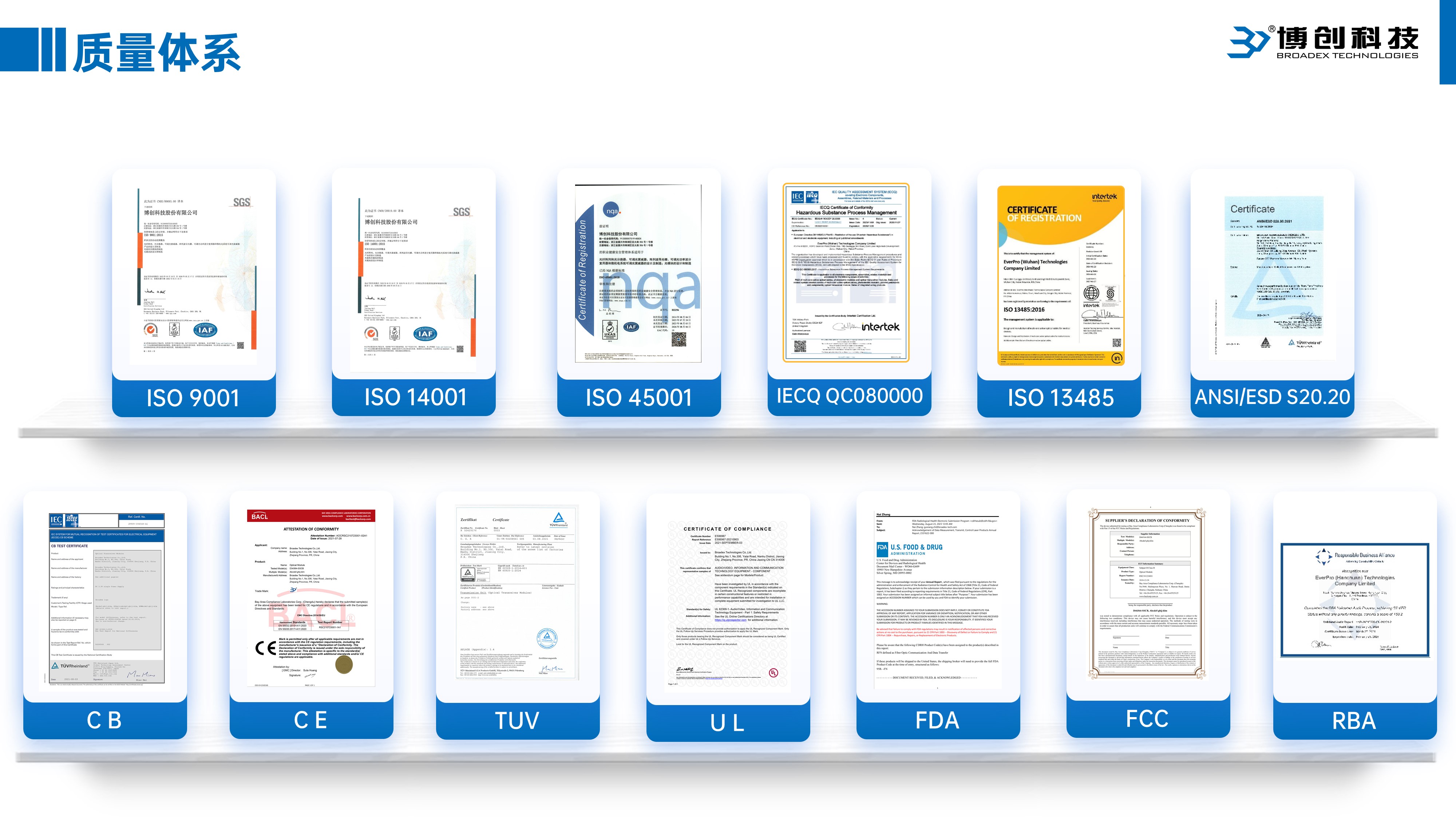 多年来,stake官网科技秉持“立异求实、客户知足、一连刷新、追求卓越”的质量目的,将精益化、质量化渗透到整个公司的各个管理环节。从原推测生产,严把质量关,在实践中一直完善并形成扎实、坚定、诚信、可靠的质量系统。批批磨练及格、次次抽检及格,无重大质量事故,铸就了高品质、值得客户信任的产品。在海内外官方审计检查中体现出高水平、高标准、高要求,stake官网科技及其分子公司先后通过ISO9001、ISO14001、ISO45001、ISO13485、IECQ QC080000、RBA等质量管理系统认证。