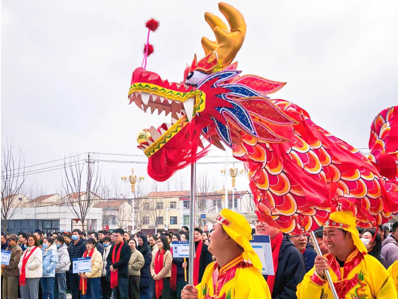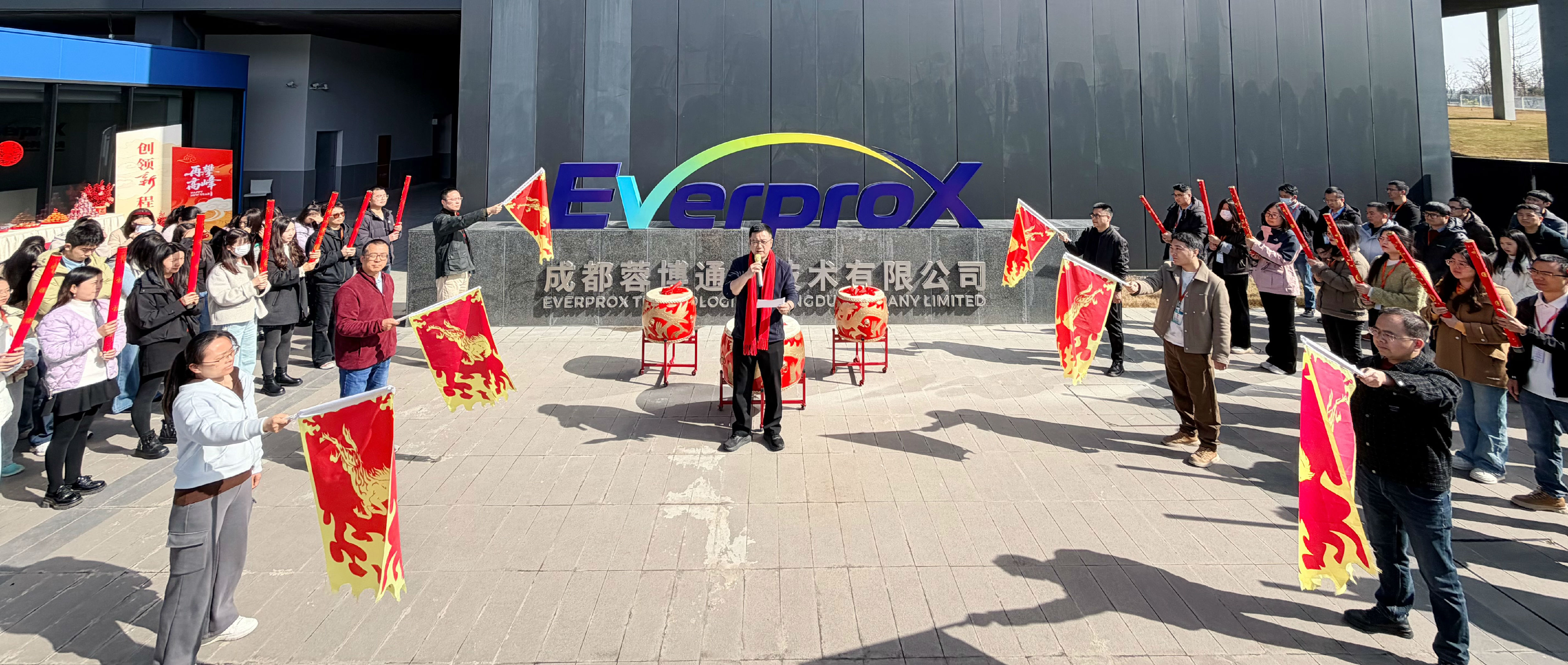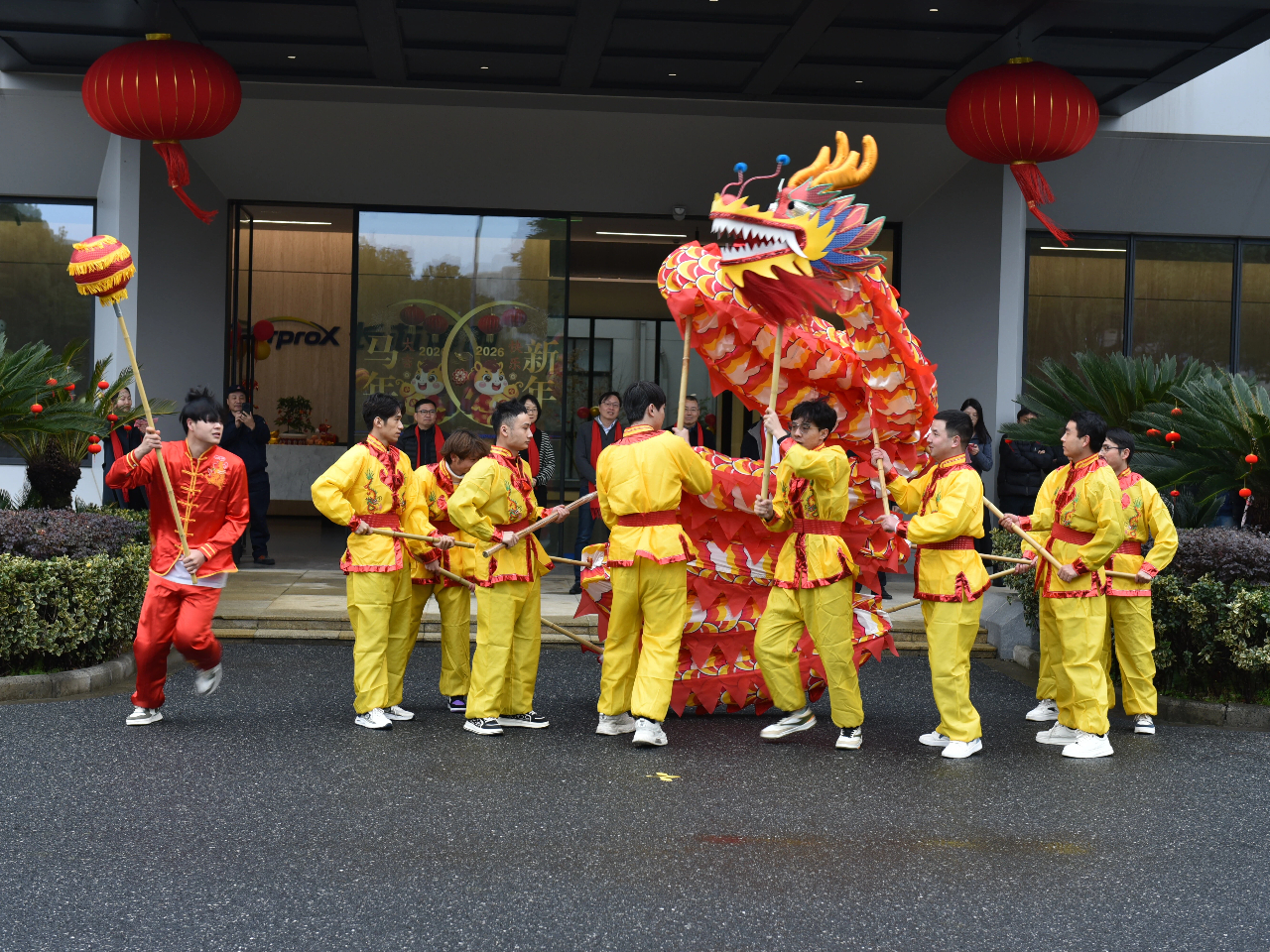 各公司总司理登台致辞,如战鼓催征,点燃全场斗志。“鼓声起,祥瑞至!”随着主持人一声令下,舞龙团队踏着鼓点翻腾入场。金龙追逐宝珠,时而仰面啸天,时而盘绕盘旋,引得各人纷纷举起手机纪录。