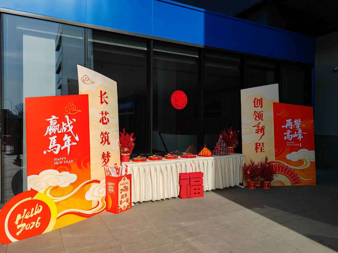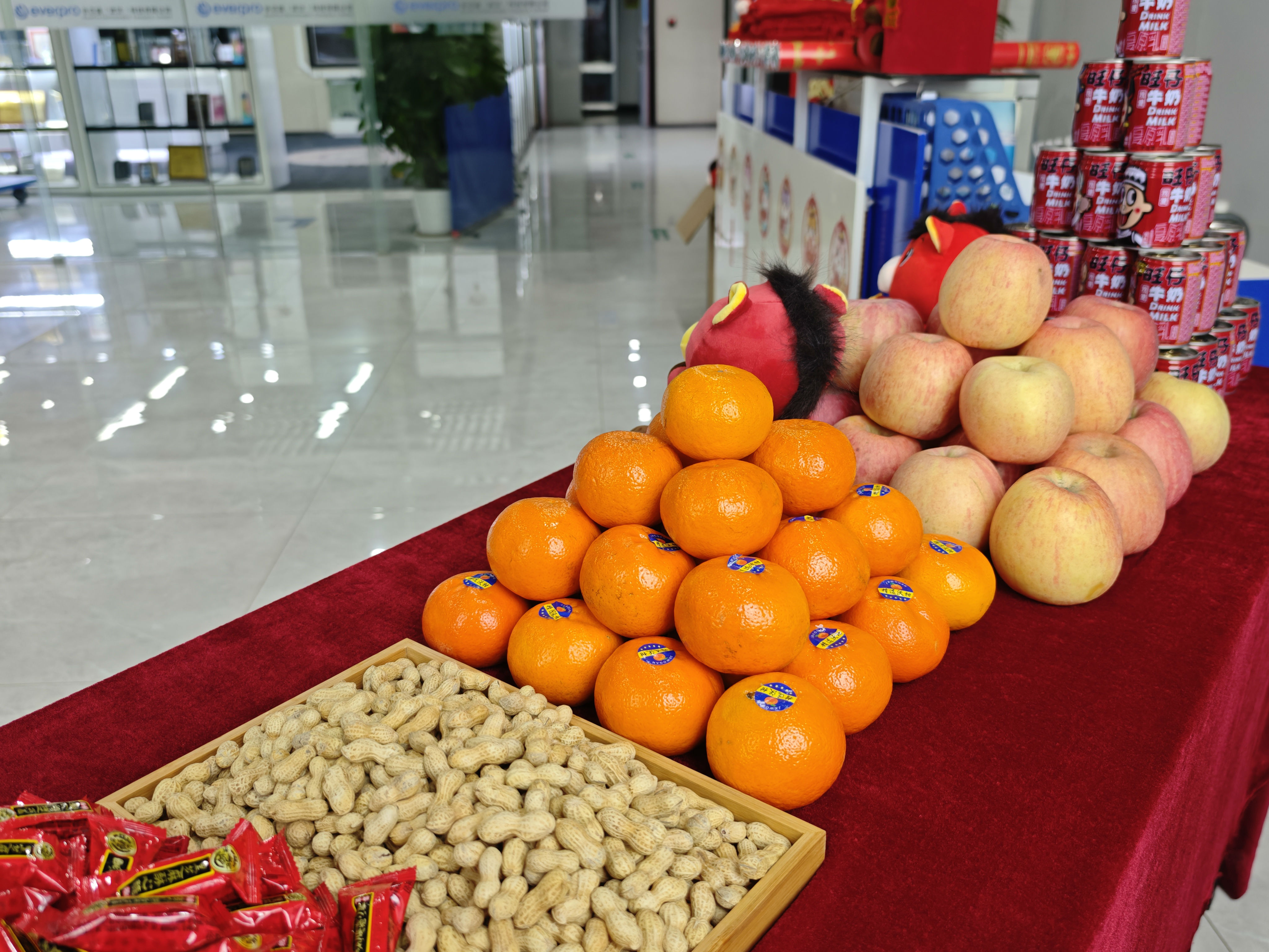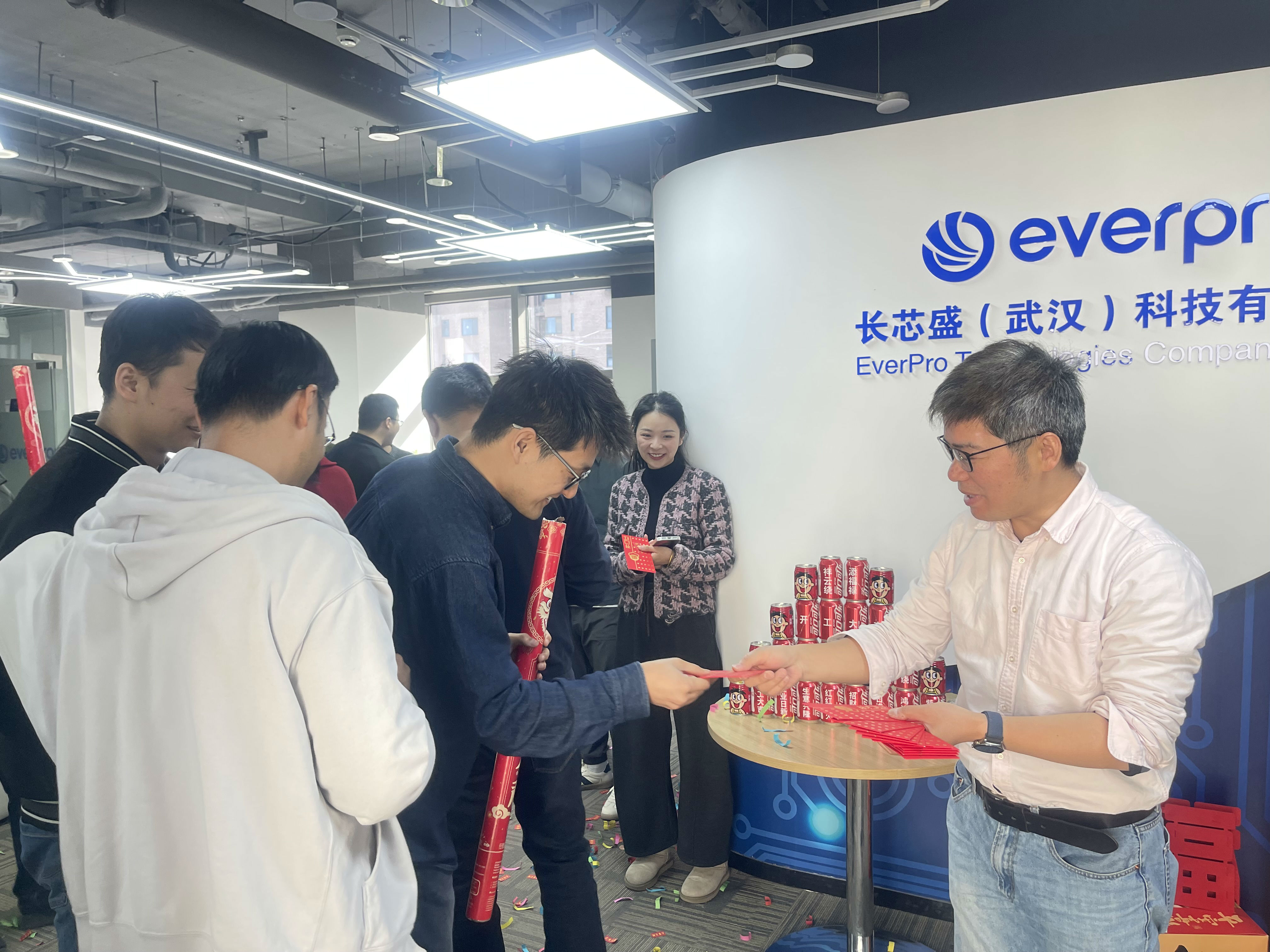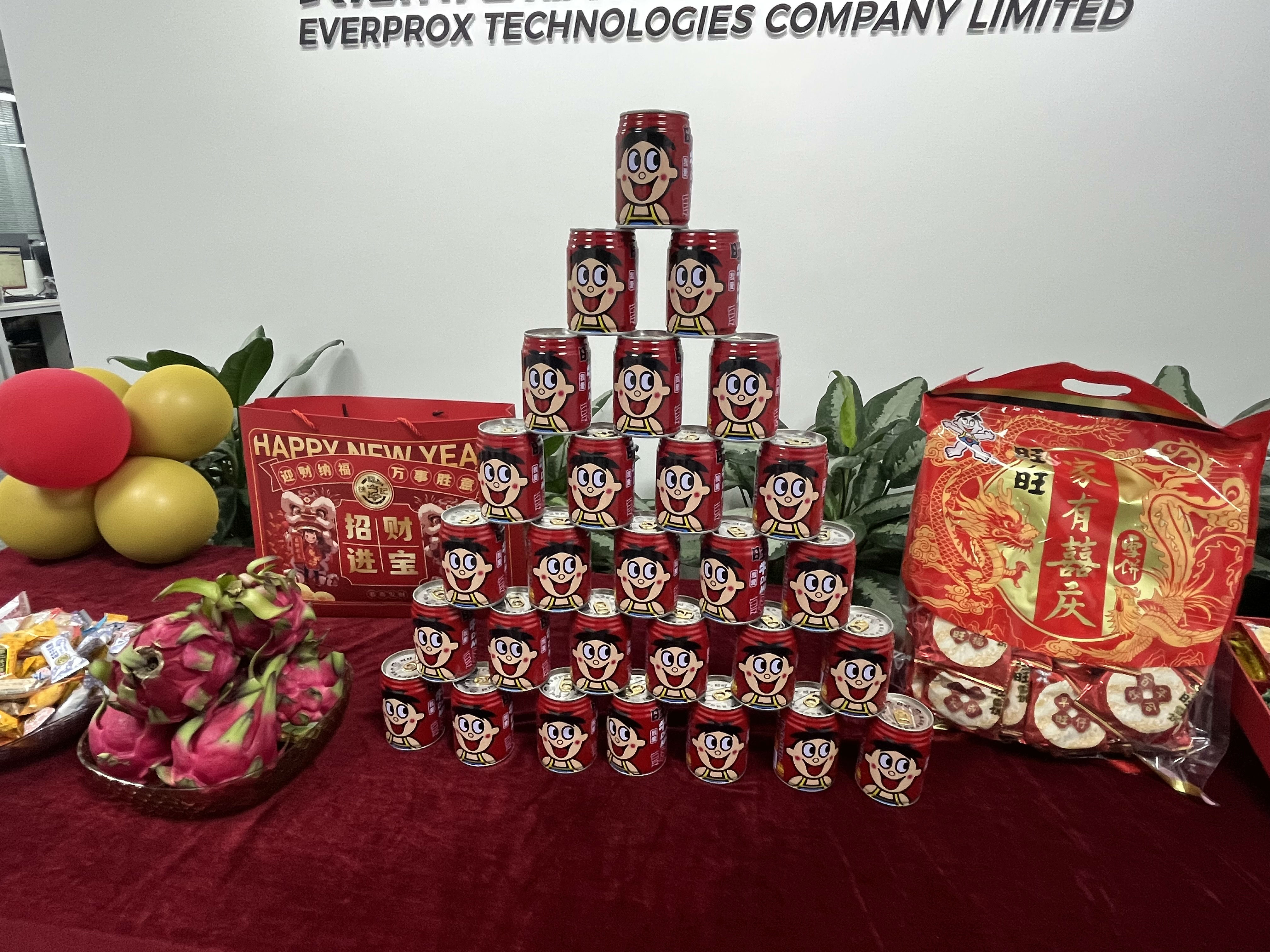 办公区与聚会室被红绸、气球装点得喜气洋洋。礼炮声声,彩带飞扬。 茶歇区摆满水果、糕点、糖果、礼物,同事们互道祝福,现场欢声笑语一直。