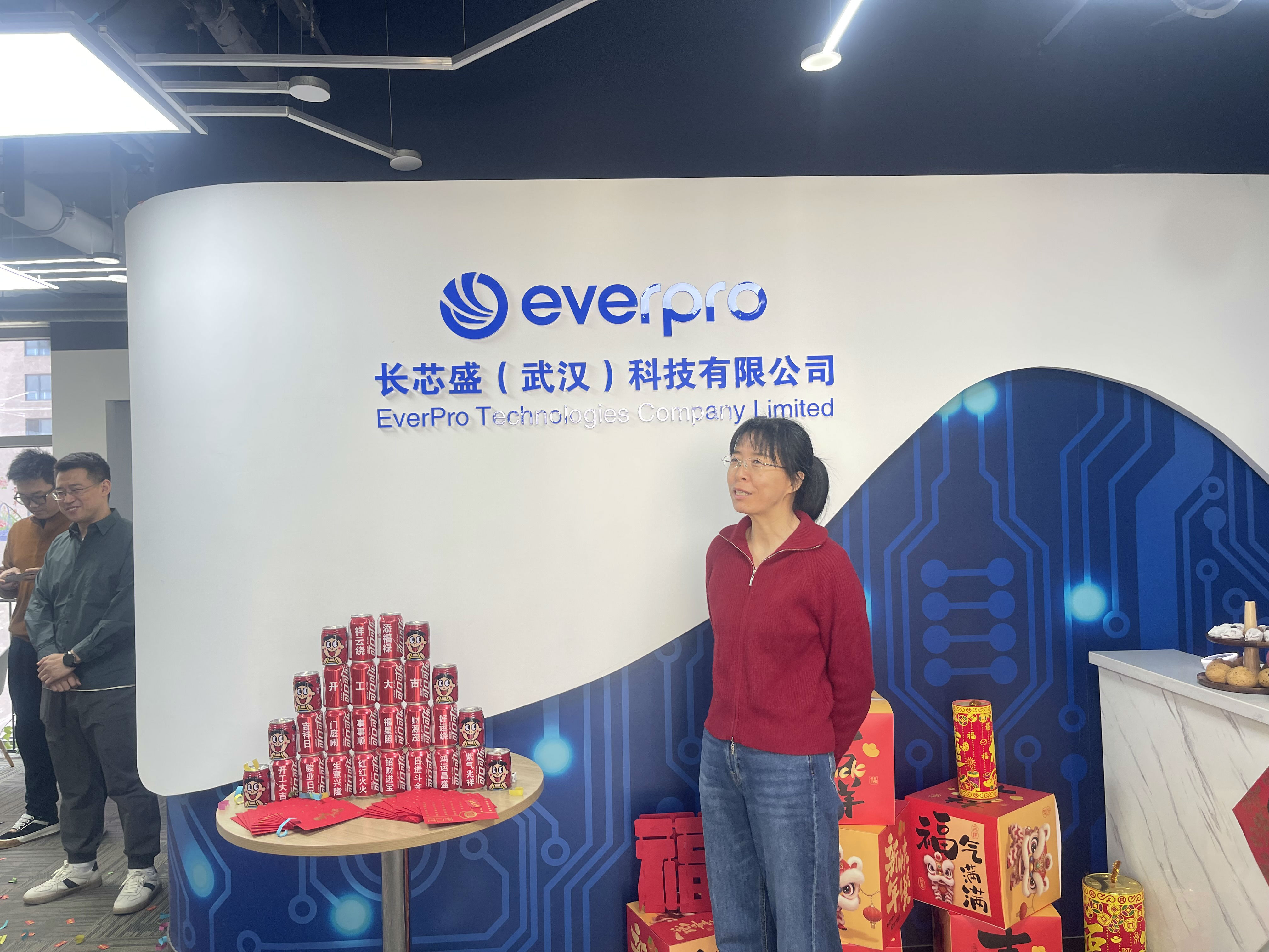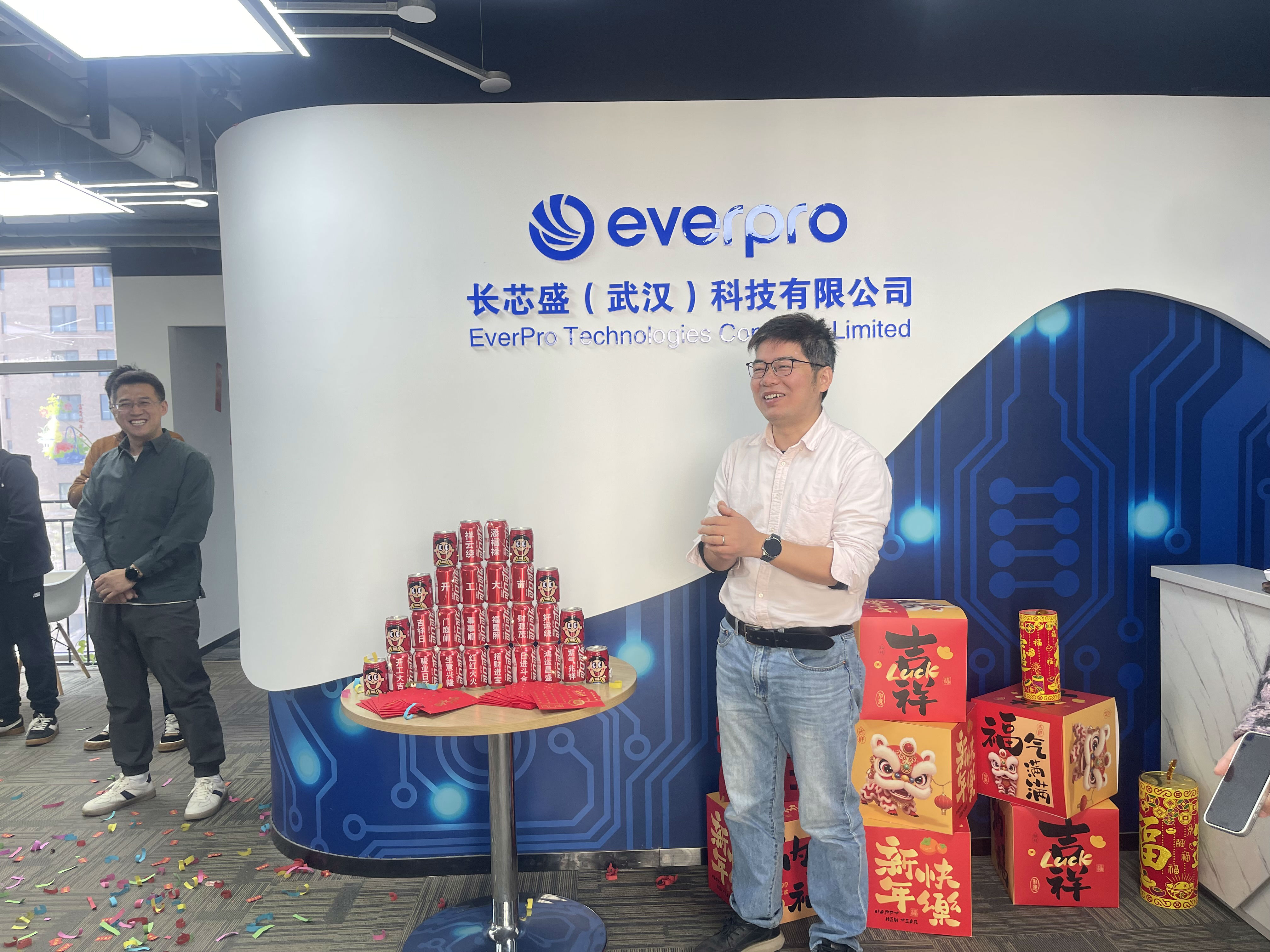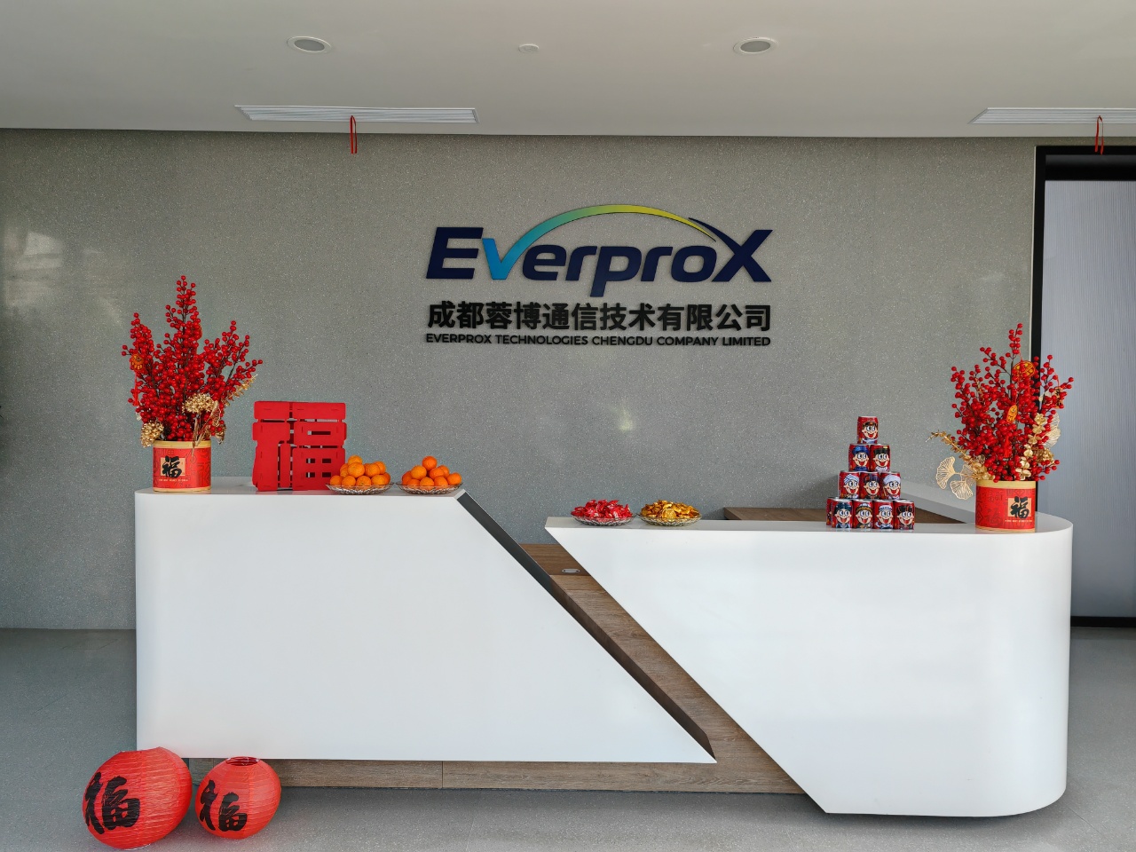 办公区与聚会室被红绸、气球装点得喜气洋洋。礼炮声声,彩带飞扬。 茶歇区摆满水果、糕点、糖果、礼物,同事们互道祝福,现场欢声笑语一直。