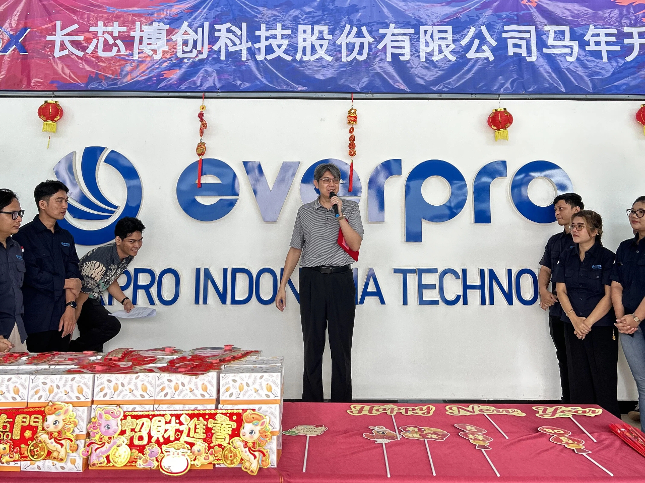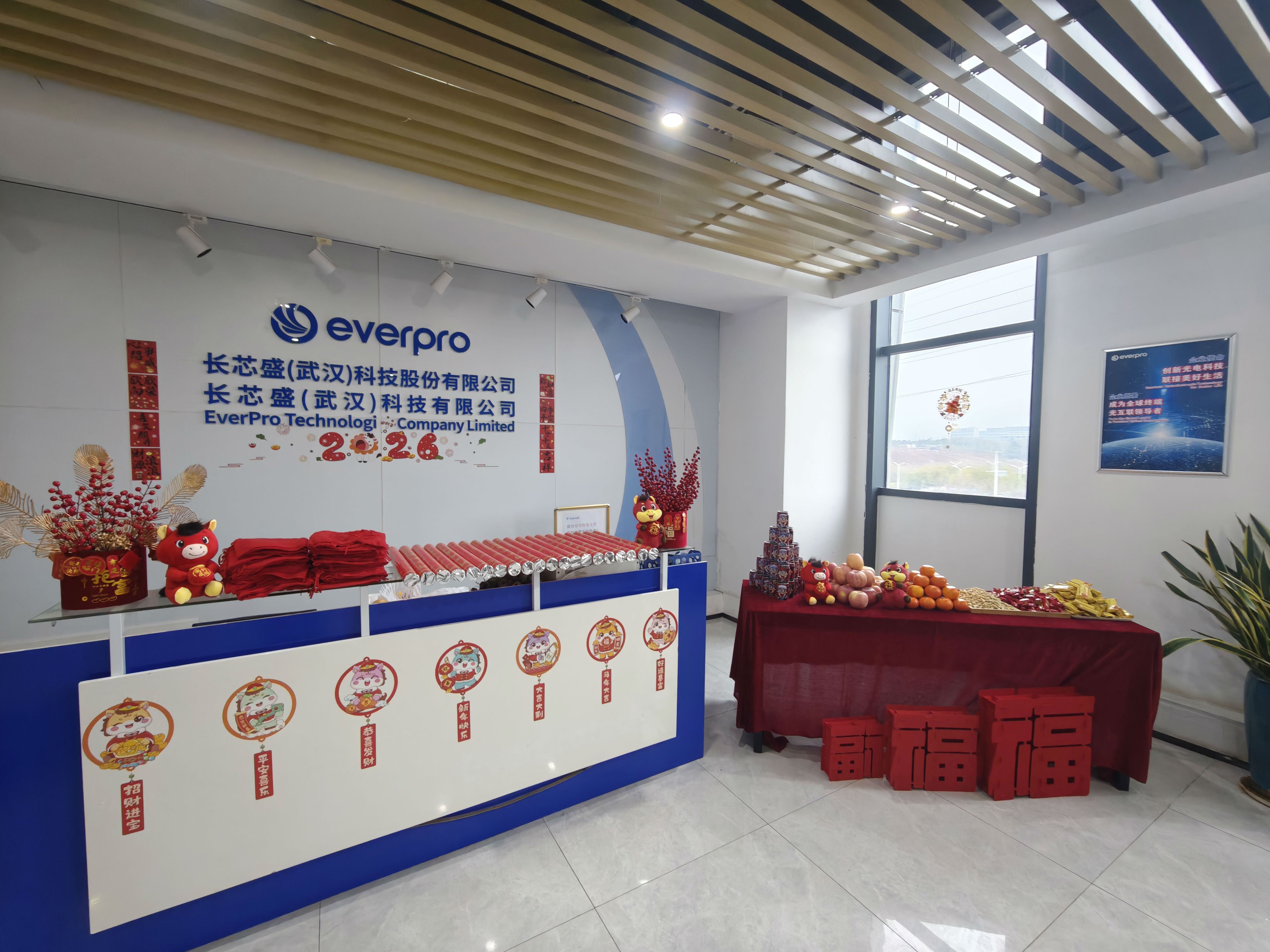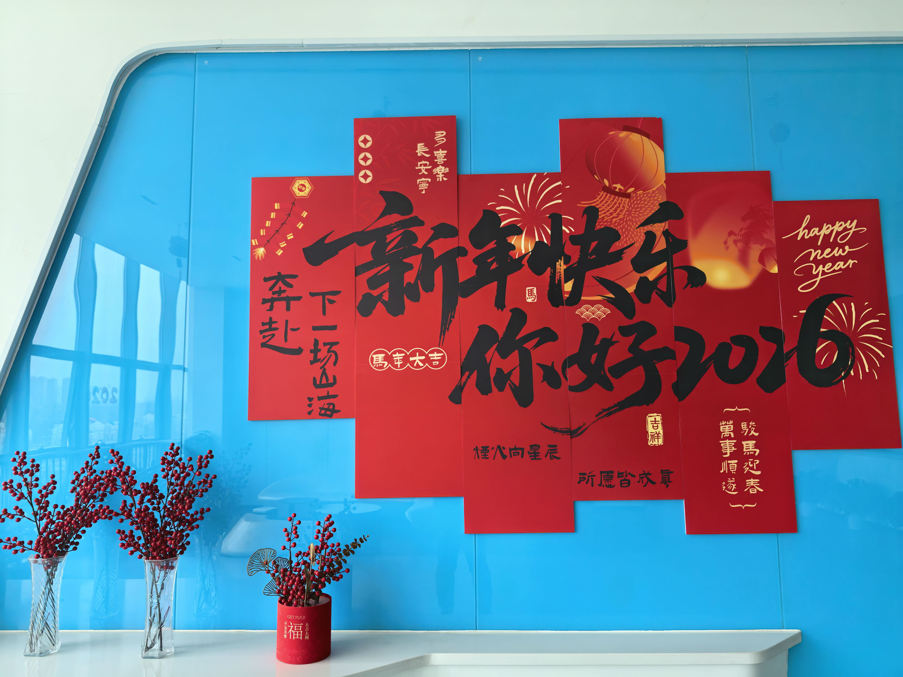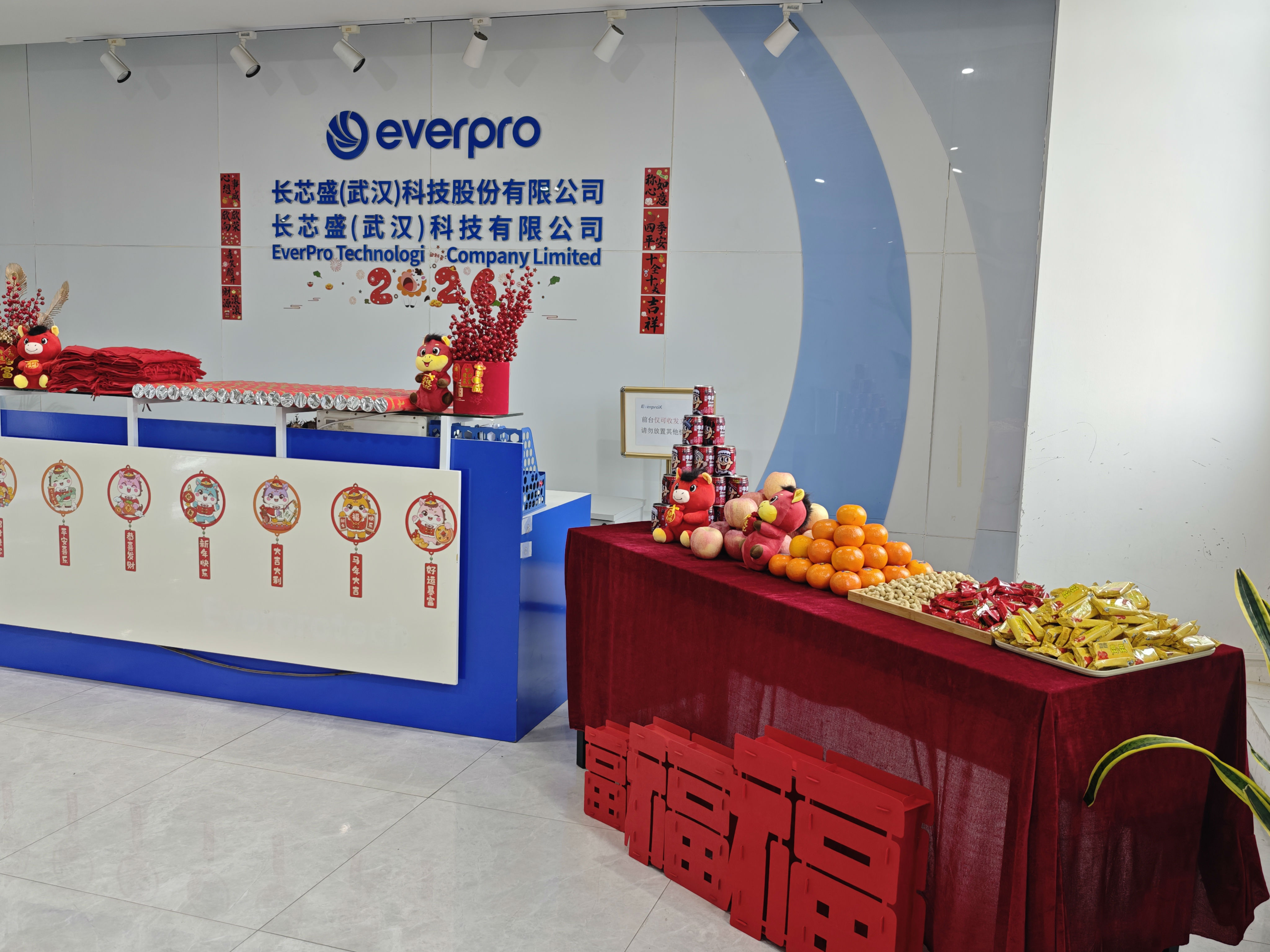 办公区与聚会室被红绸、气球装点得喜气洋洋。礼炮声声,彩带飞扬。 茶歇区摆满水果、糕点、糖果、礼物,同事们互道祝福,现场欢声笑语一直。
