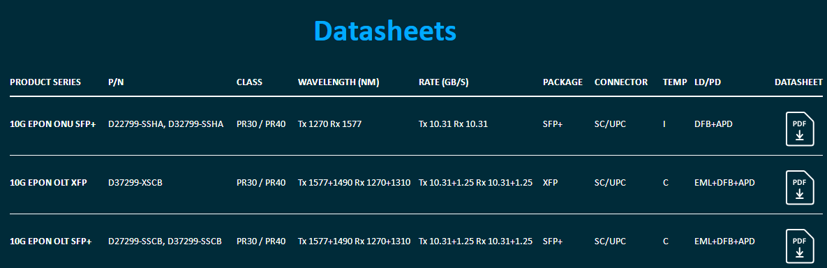 Broadex Technologies' class leading high performance and cost effective PON Optical Transceiver Modules are built utilizing our innovative COB technology. These reliable and robust modules are offered for numerous PON implementations as both OLT and ONU products.